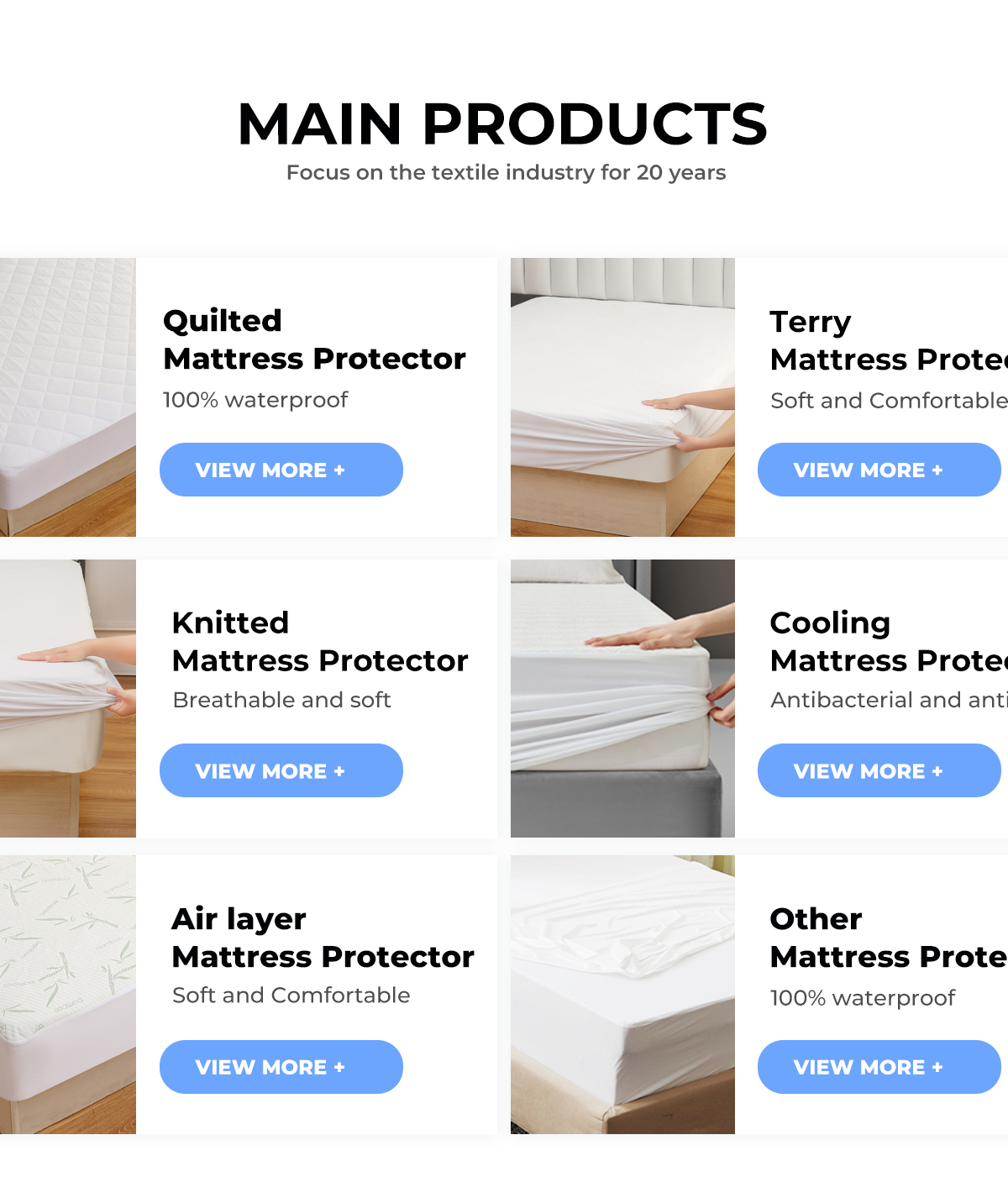Productos principales:Protector de colchón impermeable, protector de almohada impermeable, juego de cama, tictac de almohada, juego de edredón